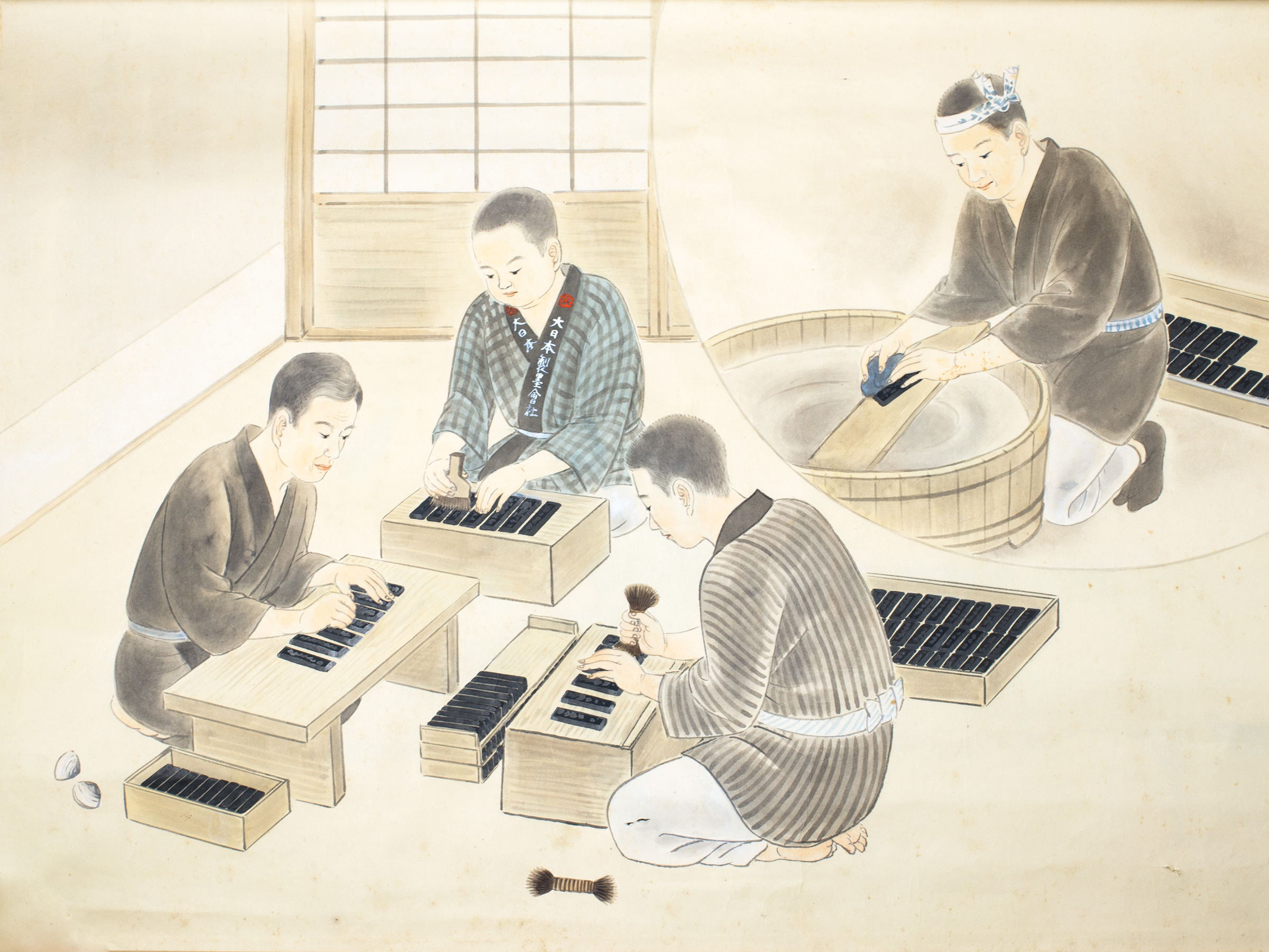 墨は煤(すす)、膠(にかわ)、香料を原料に練り合わせて作ります。